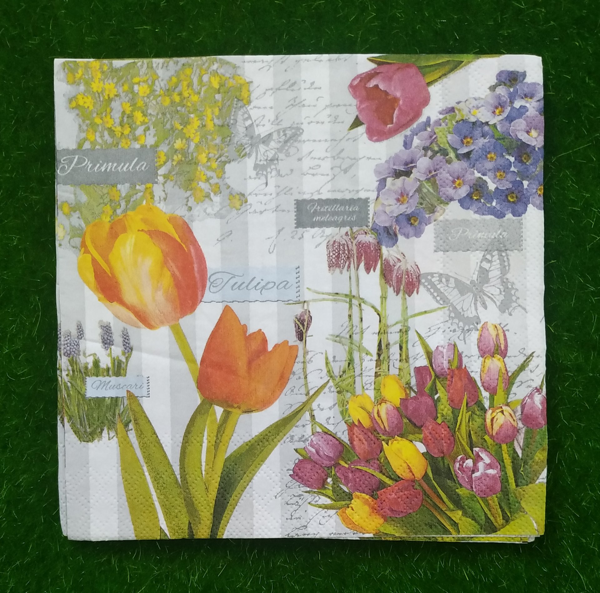 FOLDED SIZE 16.5 *16.5 CM ,UNFOLDED SIZE 33*33 CM. NAPKINS ARE 2 PLY TISSUES FROM RECYCLED PULP,PRINTED WITH NONTOXIC COLOURS, BIODEGRADABLE AND COMPOSTABLE. DECOUPAGE IS ARTISTIC SLIEGHT OF HAND. WHAT APPEARS TO BE PAINTED DESIGN ACTUALLY PAPER, GLUED IN PLACE. YOU CAN USE IT ON SURFACE LIKE GLASS, MDF, WOODEN ETC.