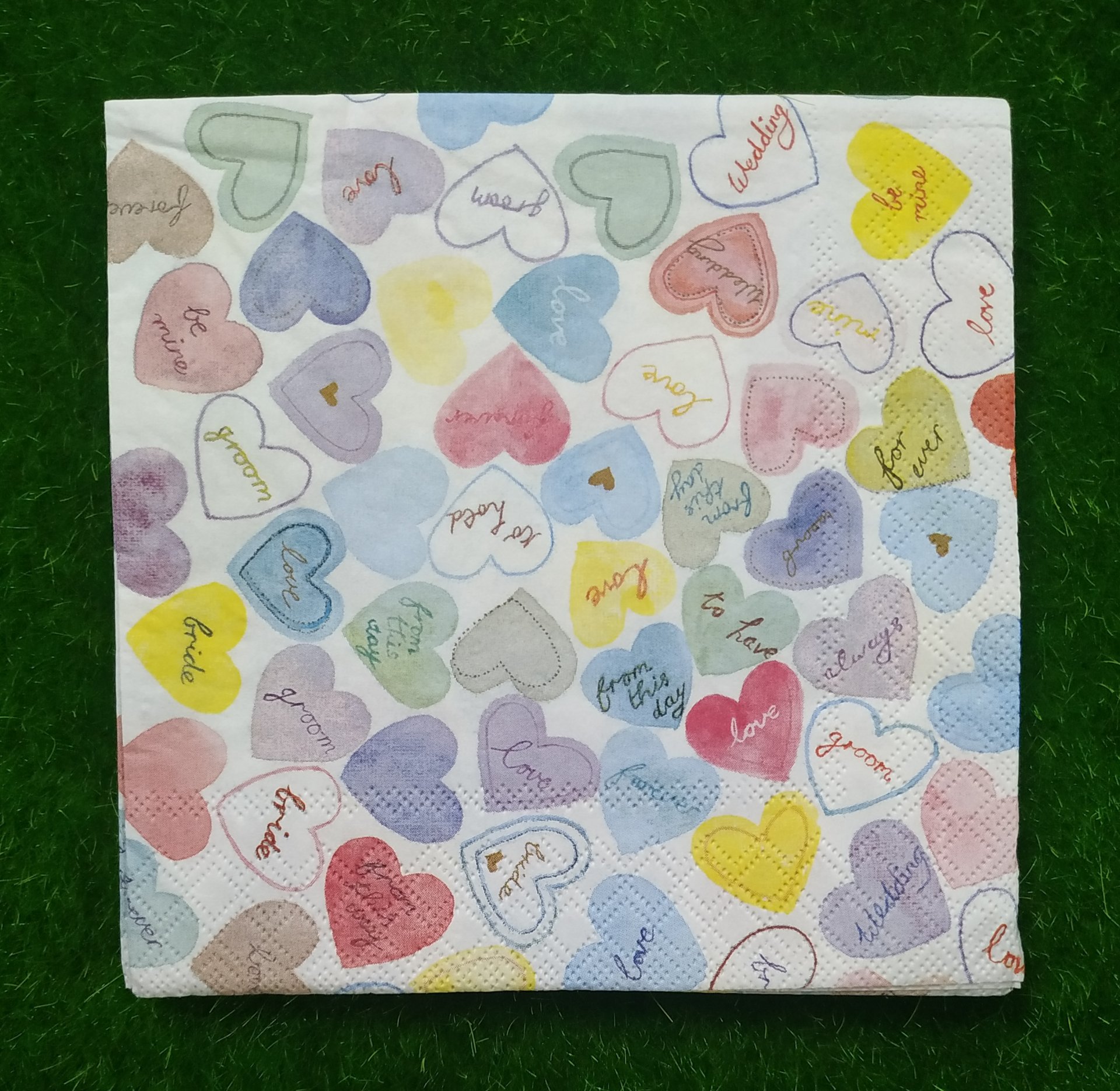 FOLDED SIZE 16.5 *16.5 CM ,UNFOLDED SIZE 33*33 CM. NAPKINS ARE 2 PLY TISSUES FROM RECYCLED PULP,PRINTED WITH NONTOXIC COLOURS, BIODEGRADABLE AND COMPOSTABLE. DECOUPAGE IS ARTISTIC SLIEGHT OF HAND. WHAT APPEARS TO BE PAINTED DESIGN ACTUALLY PAPER, GLUED IN PLACE. YOU CAN USE IT ON SURFACE LIKE GLASS, MDF, WOODEN ETC.