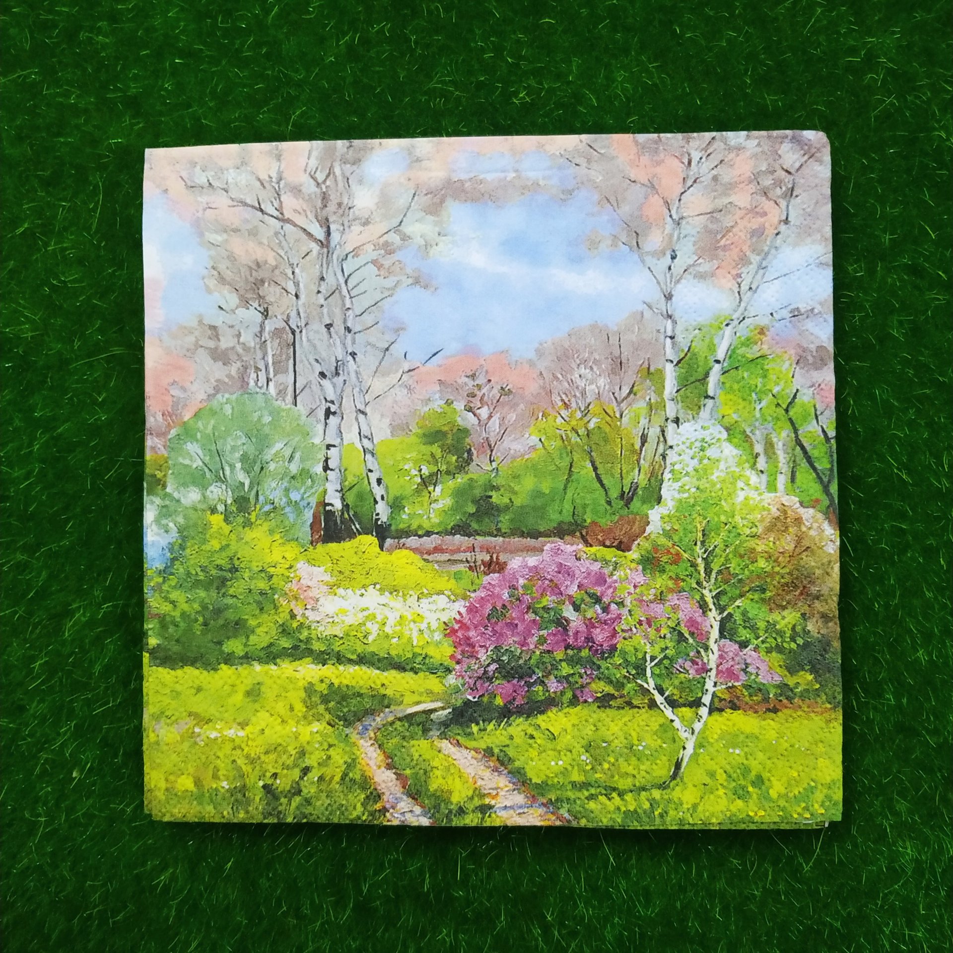 FOLDED SIZE 16.5 *16.5 CM ,UNFOLDED SIZE 33*33 CM. NAPKINS ARE 2 PLY TISSUES FROM RECYCLED PULP,PRINTED WITH NONTOXIC COLOURS, BIODEGRADABLE AND COMPOSTABLE. DECOUPAGE IS ARTISTIC SLIEGHT OF HAND. WHAT APPEARS TO BE PAINTED DESIGN ACTUALLY PAPER, GLUED IN PLACE. YOU CAN USE IT ON SURFACE LIKE GLASS, MDF, WOODEN ETC.