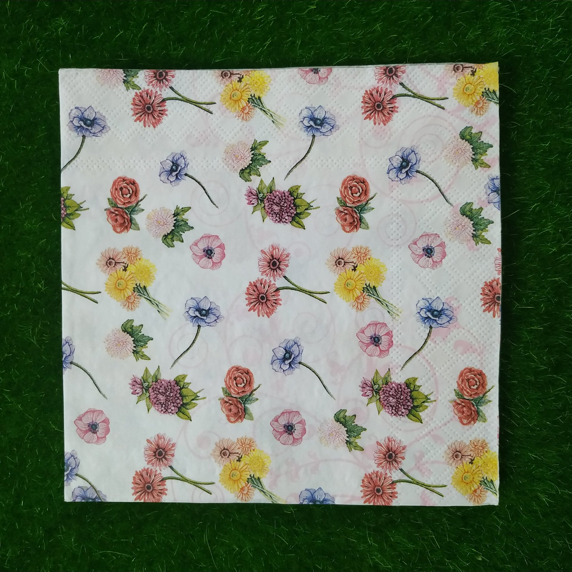 FOLDED SIZE 16.5 *16.5 CM ,UNFOLDED SIZE 33*33 CM. NAPKINS ARE 2 PLY TISSUES FROM RECYCLED PULP,PRINTED WITH NONTOXIC COLOURS, BIODEGRADABLE AND COMPOSTABLE. DECOUPAGE IS ARTISTIC SLIEGHT OF HAND. WHAT APPEARS TO BE PAINTED DESIGN ACTUALLY PAPER, GLUED IN PLACE. YOU CAN USE IT ON SURFACE LIKE GLASS, MDF, WOODEN ETC.