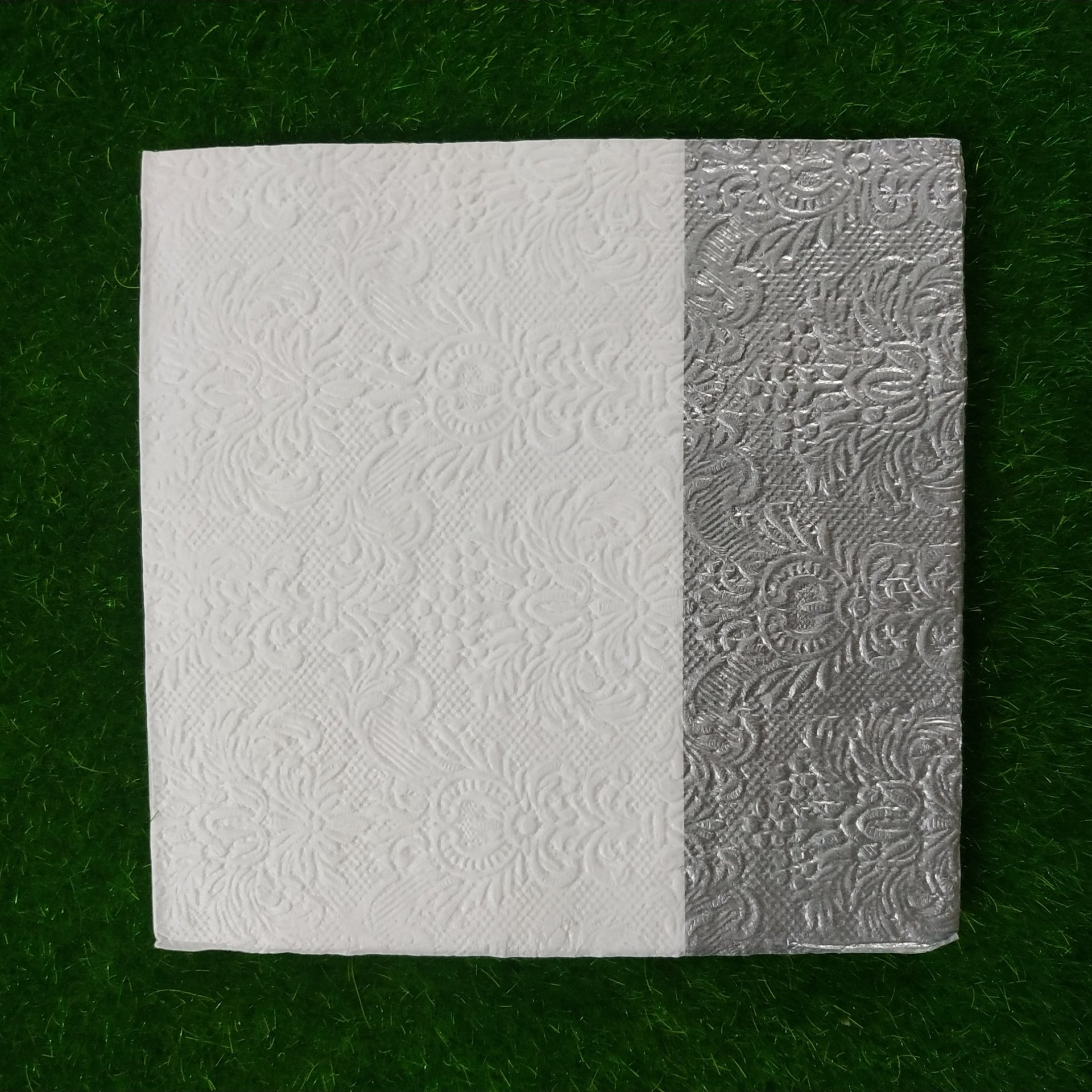 FOLDED SIZE 16.5 *16.5 CM ,UNFOLDED SIZE 33*33 CM. NAPKINS ARE 2 PLY TISSUES FROM RECYCLED PULP,PRINTED WITH NONTOXIC COLOURS, BIODEGRADABLE AND COMPOSTABLE. DECOUPAGE IS ARTISTIC SLIEGHT OF HAND. WHAT APPEARS TO BE PAINTED DESIGN ACTUALLY PAPER, GLUED IN PLACE. YOU CAN USE IT ON SURFACE LIKE GLASS, MDF, WOODEN ETC.