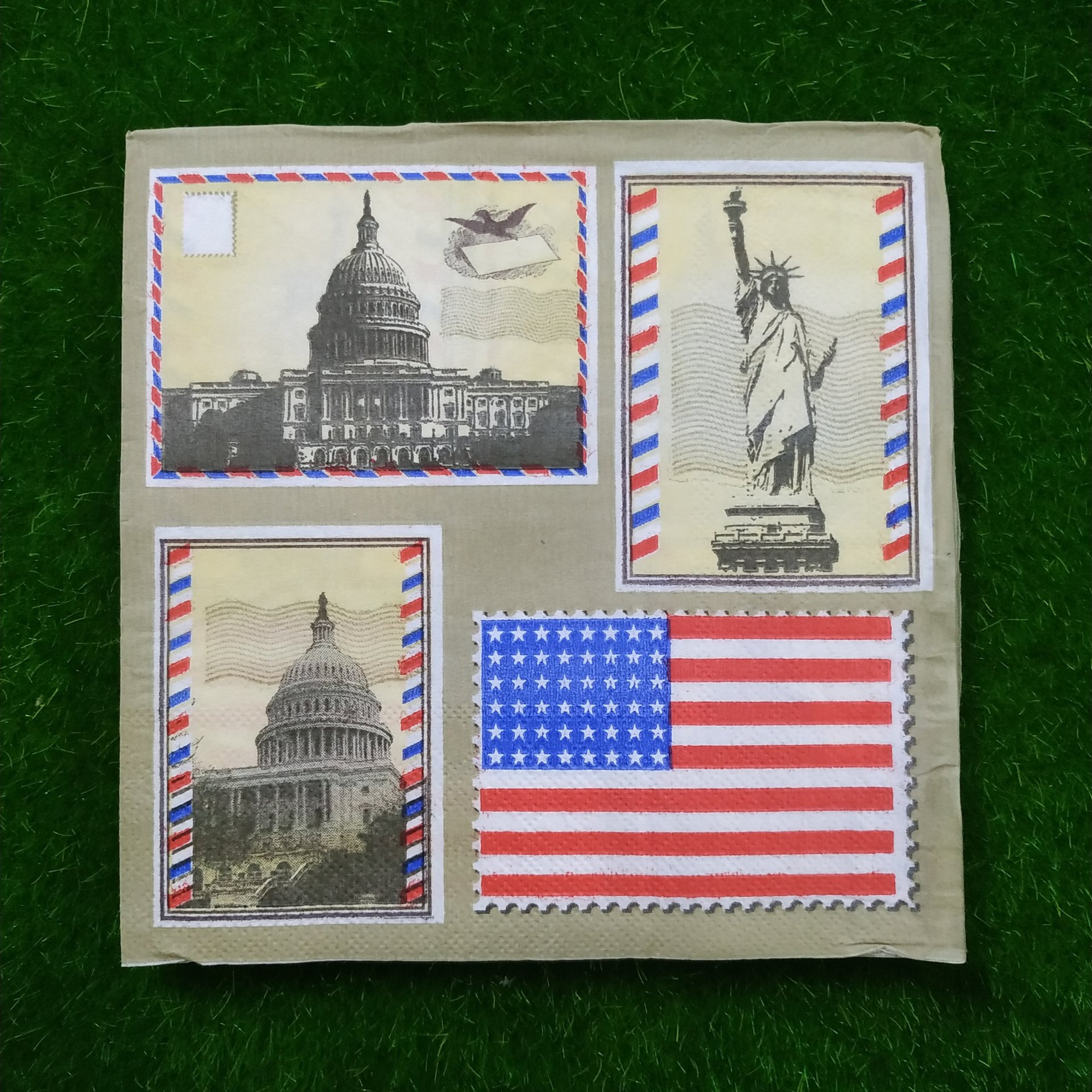 FOLDED SIZE 16.5 *16.5 CM ,UNFOLDED SIZE 33*33 CM. NAPKINS ARE 2 PLY TISSUES FROM RECYCLED PULP,PRINTED WITH NONTOXIC COLOURS, BIODEGRADABLE AND COMPOSTABLE. DECOUPAGE IS ARTISTIC SLIEGHT OF HAND. WHAT APPEARS TO BE PAINTED DESIGN ACTUALLY PAPER, GLUED IN PLACE. YOU CAN USE IT ON SURFACE LIKE GLASS, MDF, WOODEN ETC.
