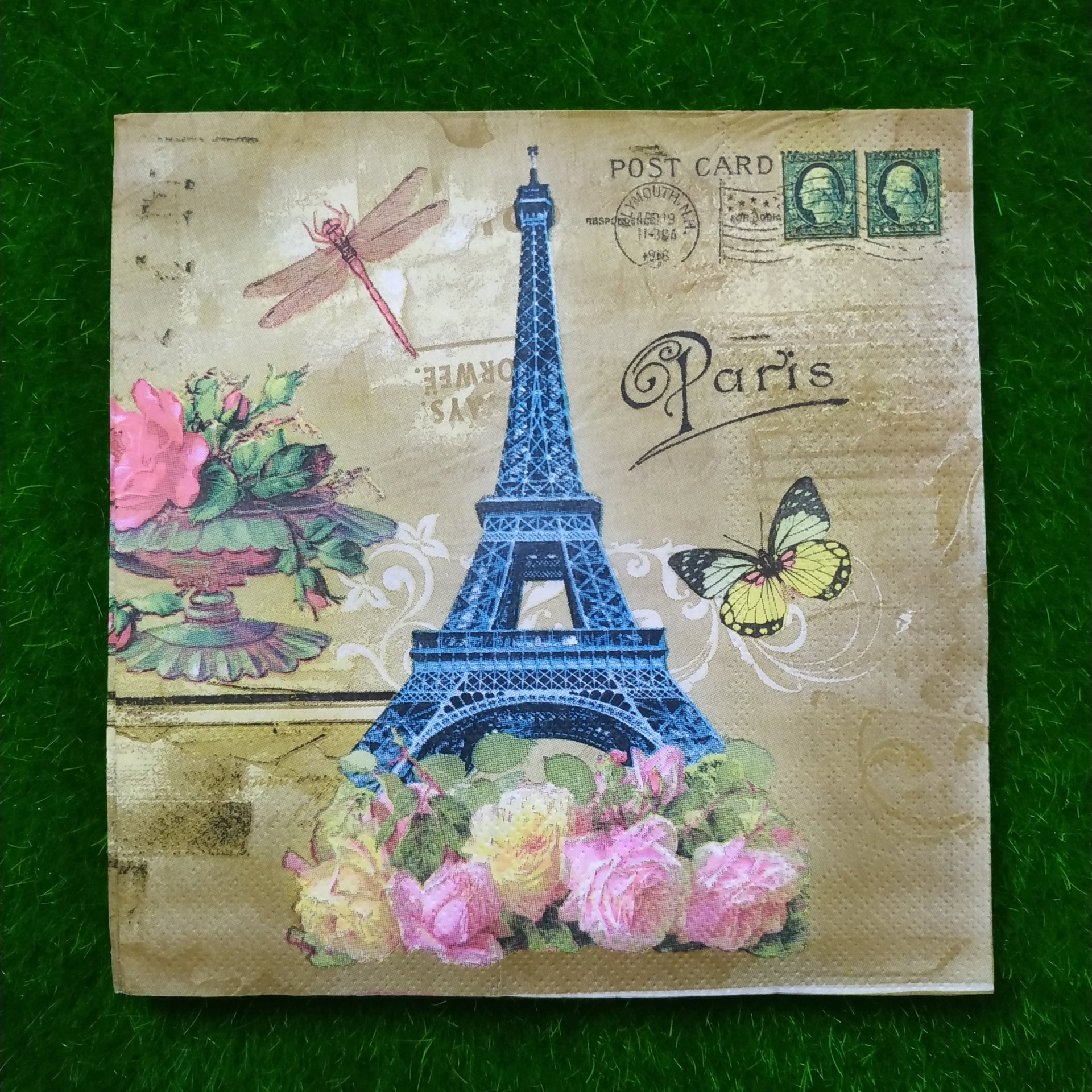 FOLDED SIZE 16.5 *16.5 CM ,UNFOLDED SIZE 33*33 CM. NAPKINS ARE 2 PLY TISSUES FROM RECYCLED PULP,PRINTED WITH NONTOXIC COLOURS, BIODEGRADABLE AND COMPOSTABLE. DECOUPAGE IS ARTISTIC SLIEGHT OF HAND. WHAT APPEARS TO BE PAINTED DESIGN ACTUALLY PAPER, GLUED IN PLACE. YOU CAN USE IT ON SURFACE LIKE GLASS, MDF, WOODEN ETC.