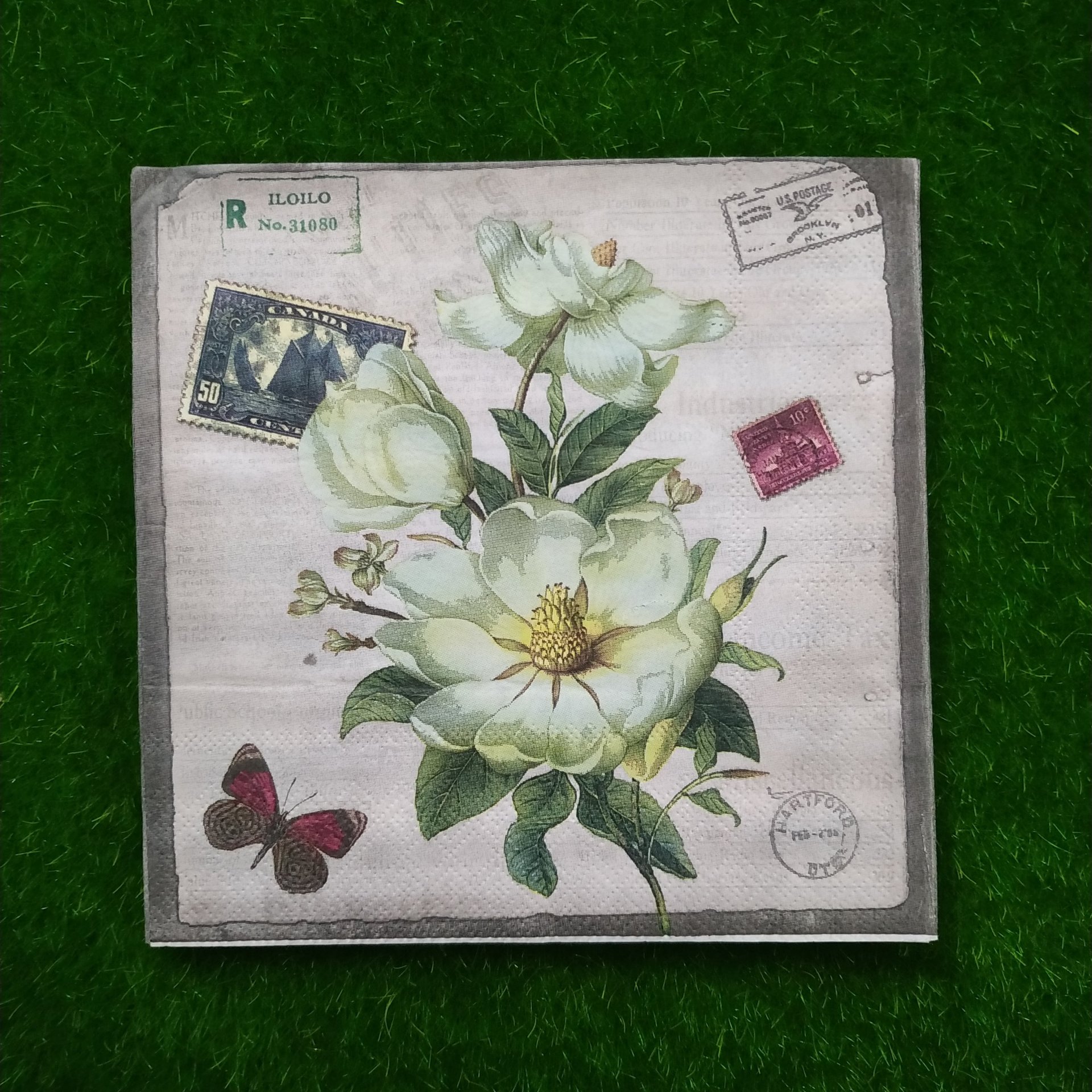 FOLDED SIZE 16.5 *16.5 CM ,UNFOLDED SIZE 33*33 CM. NAPKINS ARE 2 PLY TISSUES FROM RECYCLED PULP,PRINTED WITH NONTOXIC COLOURS, BIODEGRADABLE AND COMPOSTABLE. DECOUPAGE IS ARTISTIC SLIEGHT OF HAND. WHAT APPEARS TO BE PAINTED DESIGN ACTUALLY PAPER, GLUED IN PLACE. YOU CAN USE IT ON SURFACE LIKE GLASS, MDF, WOODEN ETC.